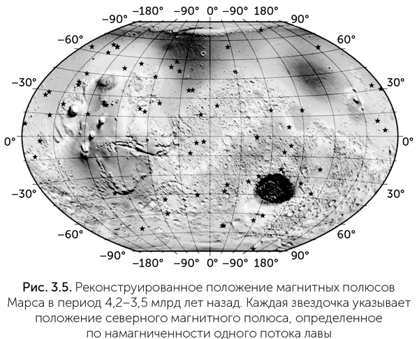 Также по магнитным аномалиям восстанавливается история магнитных полюсов Марса (Milbury et al., 2012). В этой книге использовались аномалии, связанные с застывшими потоками лавы древних вулканов, проявляющие себя не только в магнитном поле, но и как гравитационные аномалии – участки коры повышенной плотности. Намагниченность лавы, застывшей в нойскую эпоху (до 3,8 млрд лет назад), указывает на расположение магнитных полюсов в низких широтах, не выше 60 градусов широты, большей частью в районе плато Фарсида и противоположном районе планеты – равнине Эллада. Намагниченные лавы раннегесперийского возраста (3,8–3,6 млрд лет) встречаются значительно реже, намагниченность их слабее, а ее направление указывает на магнитные полюсы, близкие к современным географическим. Намагниченные лавы моложе 3,5 млрд лет при измерениях с орбиты не обнаружены вовсе (рис. 3.5).