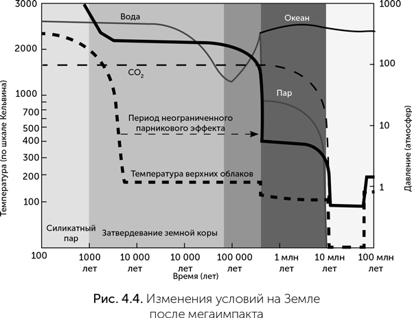 Для формирования океанов необходимо, чтобы поверхность Земли была покрыта корой, т. е. чтобы «океан магмы» покрылся твердыми породами. С учетом давления древней атмосферы жидкая вода могла существовать при температурах до 300–350 °C. Конденсация водяных паров из атмосферы в океан уменьшает парниковый эффект и температуру на поверхности Земли, поэтому переход от воды в атмосфере к океанам шел с ускорением и мог произойти очень быстро, в течение 10 000 лет. Расчеты показывают, что для затвердевания земной коры и конденсации океанов необходимо, чтобы тепловой поток из недр Земли упал ниже примерно 150 Вт/м?. Этот порог мог быть пройден в первый раз еще до окончания формирования Земли и удара, породившего Луну. Однако после каждого столкновения выделение тепла внутри Земли усиливалось за счет опускания железного ядра упавшего планетного зародыша к центру Земли, и поверхность опять превращалась в океан магмы (рис. 4.3).