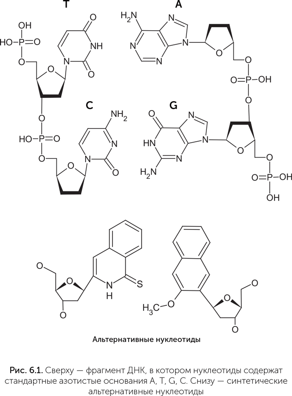 Ответ на этот вопрос пришел с неожиданной стороны. В последние годы бурно развивается синтетическая биология, целью которой является создание организмов с принципиально новыми свойствами. Например, коллектив под руководством Стивена Беннера достиг больших успехов в создании альтернативных нуклеотидов. Эти искусственные звенья хорошо встраиваются в ДНК и РНК обычными природными ферментами, образуют комплементарные пары друг с другом, но не со стандартными нуклеотидами А, Г, Т и Ц, и расширяют нуклеотидный алфавит до шестибуквенного (рис. 6.1) (Malyshev et al., 2014; Yang et al., 2011 (русский краткий анонс: http://www.chemport.ru/datenews.php?news=2557)).