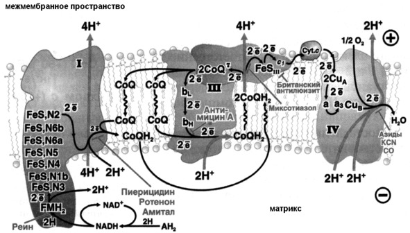 Первый комплекс – NADH-дегидрогеназа (комплекс I), сукцинат-дегидрогеназа (комплекс II), убихинон-цитохром с редуктаза (комплекс III), цитохром оксидаза (комплекс IV).