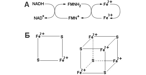 Рисунок 12: А – схема окислительно-восстановительных реакций в комплексе I; Б – структура FeS коферментов