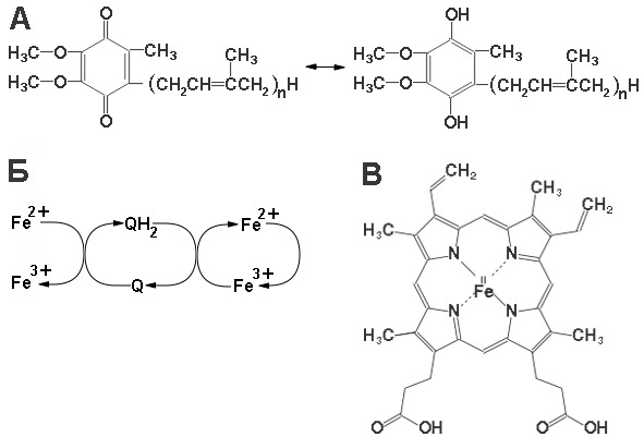 Рисунок 13: А – схема окислительно-восстановительной реакции с убихиноном; Б – схема окислетельно-восстановительных реакций между FeS белком и убихиноном, между убихиноном и гемом; В – структура гема в цитохромах