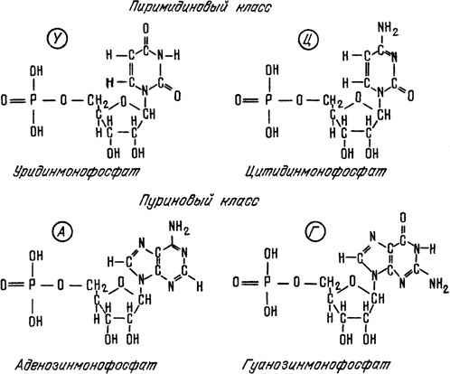 Рис. 6. Полные химические формулы мономерных звеньев РНК-нуклеотидов (известных также под названием нуклеозидмонофосфатов. сокращенно НМФ). Сверху приведены пиримидиновые нуклеотиды (У и Ц). а снизу – пуриновые (А и Г]. Нуклеотиды, входящие в состав ДНК, отличаются тем, что у них вместо правой нижней группы ОН стоит просто Н. Поэтому ДНКовые нуклеотиды называют дезоксинуклеозидмонофосфатами и обозначают как дНМФ. Кроме того, в ДНК вместо уридинового нуклеотида входит тимидиновый, у которого верхняя СН-группа в кольце заменена на группу СНН3