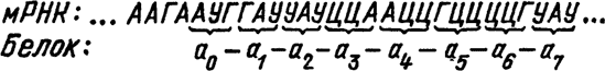 На этой схеме а0, а1… обозначают аминокислотные остатки белка. Напомним, что их может быть 20 типов. А сколько типов кодонов? Легко подсчитать, что всего существует 43 = 64 различных кодона. Так что же, не всякому кодону соответствует аминокислота? Да, не всякому.