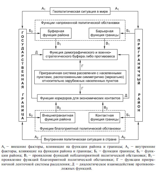 А. Г. Гранберг [2000, c. 66] выделяет контактную, барьерную и фильтрующую функции границы. По нашему мнению, последняя функция является производной от двух первых и образуется за счет их сочетания. Фильтрационность границы – это основа национальной безопасности страны, проявление сбалансированности контактной и барьерной функций.