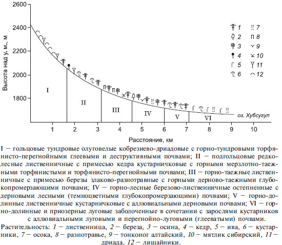Приведенное ниже описание ландшафтов основных ключевых участков, характеризующих наиболее типичные физико-географические условия трансграничной территории Прихубсугулья, относится к горнотаежной зоне с гумидным типом вертикальной поясности [Ногина, Доржготов, 1982]. Высотно-поясное распределение ландшафтов на южном макросклоне хр. Большой Саян отображено на ландшафтном профиле (рис. 4.1).