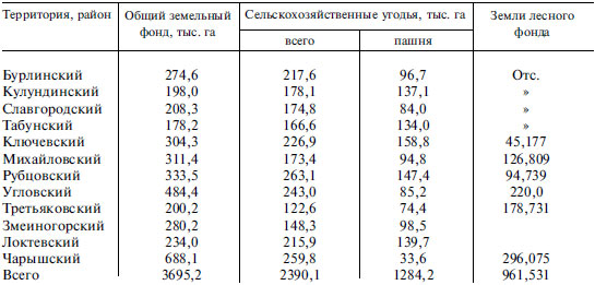 Земельные ресурсы приграничных районов Алтайского края. Приграничные районы Алтайского края включают в себя практически все категории земель. Большая часть земель расположена в степных равнинных районах, которые по почвенно-географическому районированию отнесены к зоне каштановых почв сухих степей Кулундинской впадины в юго-восточной части Западной Сибири. В почвенном покрове преобладают каштановые и темно-каштановые типы. Более 20 % площадей приходится на солончаковые почвы. Сельское хозяйство в целом ведется в зоне «рискованного земледелия» – малого увлажнения и периодических засух. Основная специализация хозяйств района: производство растениеводческой продукции, в основном зерновых культур, мясомолочное скотоводство [Атлас., 1978, т. 1].