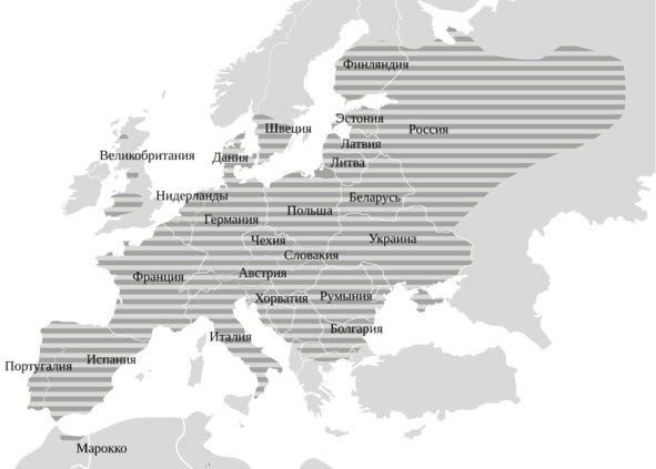 Лесные хорьки распространены почти по всей Европе, к северу до средней Карелии, к востоку до Уральских гор, к югу до Черного моря и к западу – до Атлантического океана. Ареал обитания охватывает также небольшой участок на северо-западе Африки (рис. 4).