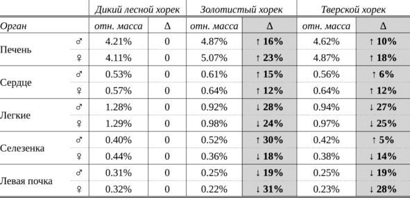 По данным Федосеевой и Тюриной (2011), масса клеточных хорьков стала на 30—80% больше, чем у их диких предков, при этом длина тела увеличилась всего на 14—15%. Укрупнение размеров тела сопровождалось непропорциональным изменением ряда внутренних органов: относительная масса печени стала на 10—23%, а сердца – на 6—15% выше «дикой» нормы, тогда как легкие и почки уменьшились (соответственно на 24—28% и 19—31%) (табл. 2).
