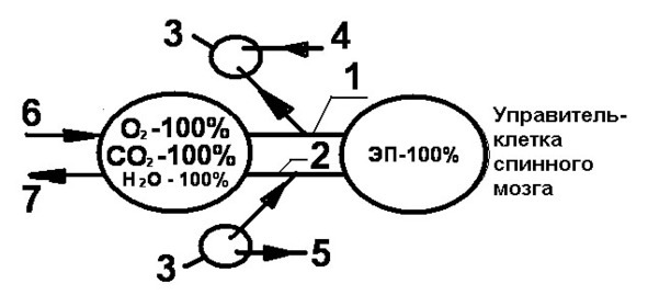 По каналу 1 поступает информация и энергия к клетке и лимфоузлу 3, а по каналу 2 осуществляется обратная связь с управителем. Циркуляция лимфы, крови по капиллярам 4,5 и 6,7.