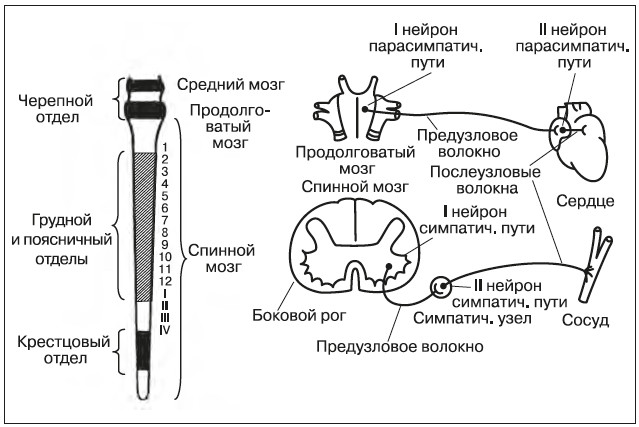 Справа – строение эфферентной части рефлекторной дуги вегетативных рефлексов