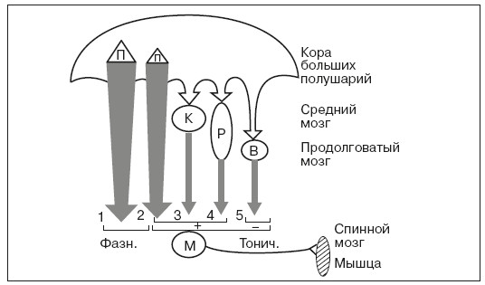 1 – быстрая подсистема и 2 – медленная подсистема корково-спинномозгового пути (пирамидного тракта); 3 – корково-красноядерно-спинномозговой путь. Латеральная система – 1, 2, 3. Медиальная система – 4, 5. М – мотонейрон спинного мозга, получающий фазные (Фазн.) и тонические (Тонич.) возбуждающие (+) и тормозящие (-) влияния; П – пирамидная система: К – красная ядра; Р – ретикулярная система; В – вестибулярные ядра