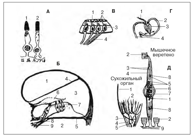 Д – проприорецепторы. Мышечное веретено: 1 – афферентное нервное волокно. 2 – экстрафузальные мышечные волокна (перерезаны), 3 – внутриверетенные (интрафузаль-ные) мышечные волокна, 4 – оболочка веретена, 5 – ядра, 6 – ядерная сумка, 7- чувствительные нервные окончания, 8 – эфферентные нервные гамма-волокна, 9 – сухожилие.