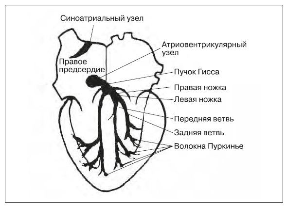 Рис. 18. Схема расположения водителя ритма (пейсмекера) и проводящей системы на фронтальном разрезе сердца