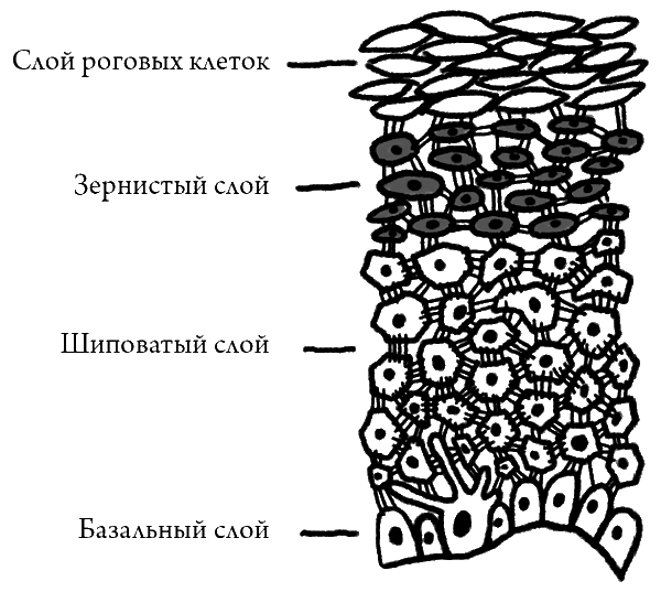 Давайте подробнее остановимся на строении эпидермиса. Он состоит из четырех различных клеточных слоев: