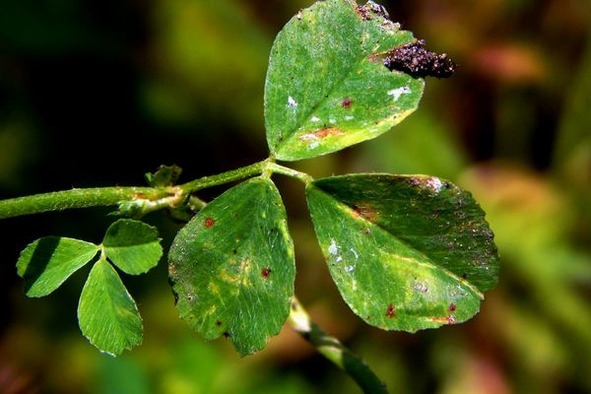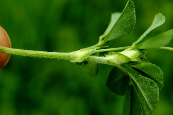 Тройчатые листья растения расположены на коротких черешках. Каждый листик имеет обратнояйцевидную или ромбическую форму с выемчатой верхушкой и клиновидным основанием. Снизу листовая пластинка покрыта железистым или простым опушением, сверху – практически голая или же с редким опушением. Прилистники наполовину сросшиеся.