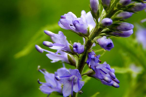 Цветков в соцветии очень много – около 450. Оттенок лепестков – от чисто-синего до сине-фиолетового. Венчик у цветка – около 6 мм. Но самое удивительное и красивое в цветках длиннолистной вероники – это две длиннющие (намного длиннее венчика) тычинки с большими пыльниками.
