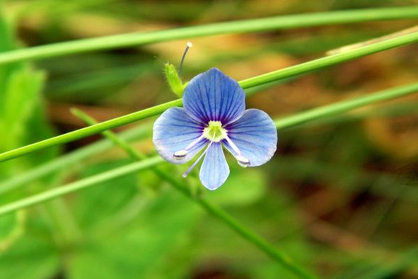 Небесно-голубой оттенок, которым обладает венчик цветков, отыскать в траве легко: глаза невольно поворачиваются в сторону полянки с цветущей вероникой. По лепесткам, а их у растения 4—5, проходят темные жилки.