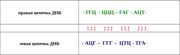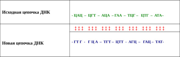 Вертикальная двусторонняя стрелка указывает на изменения нуклеотидного состава в цепочках молекулы ДНК (принцип комплементарности).