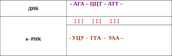 Вертикальная двусторонняя стрелка указывает на изменения нуклеотидного состава в цепочках молекулы ДНК на цепочку молекулы и-РНК в ходе процесса транскрипции (принцип комплементарности).