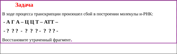 «Переписывание» информации на и-РНК происходит по принципу комплементарности. Вспомните, что в ходе транскрипции происходит переписывание информации из участка одной цепи ДНК на цепь и-РНК: