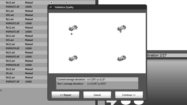 Процедура калибровки – процесс, при котором iViewX производит установление соответствия между позицией глаза, зафиксированной камерой, и точкой взгляда в пространстве, так называемой точки связи. Калибровка также определяет плоскость в пространстве, в которой фиксируется взгляд. Так как установленное соотношение сильно зависит от системных настроек, испытуемого и его положения, калибровка проводится перед каждым блоком и для каждого испытуемого. В исследовании проводится калибровка с девятью калибровочными точками, что дает достаточно высокую точность.