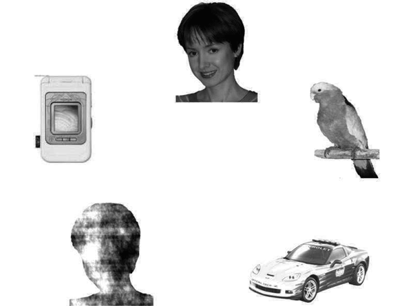 Третий вид представляет собой восемь изображений, на которых помещены разные объекты: изображение телефона, машины, птицы, лица человека и контур человеческого лица, заполненный шумовым фоном.
