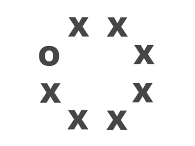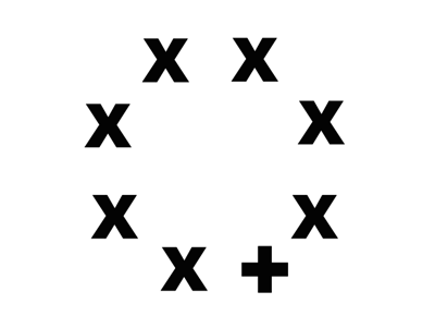 Второй блок состоит из шестнадцати изображений, на которых по окружности распределены абстрактные символы, один из которых отличается от остальных. Одинаковые символы – диагональный крест (X), отличающийся символ-круг (0 или +). Ребенку в возрасте 5 месяцев проще выделить отличающийся стимул в виде круга, так как внимание младенцев привлекают фигуры концентрической формы. Отличающийся символ в виде горизонтального креста считается более сложным для восприятия детей этого возраста.