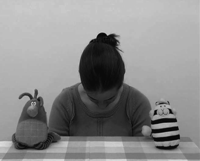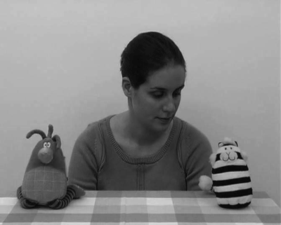Третий блок состоит из шести видеороликов, на которых модель сидит за столом, опустив голову; слева и справа от нее находится по одной игрушке. Модель поднимает голову и смотрит прямо, привлекая внимание ребенка, затем поворачивает голову и переводит взгляд на одну из игрушек.