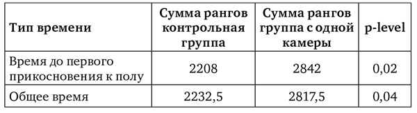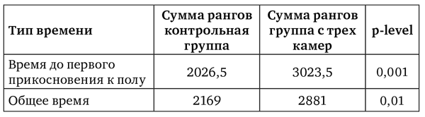 Статистическая оценка значимости различий между контрольной группой и группой, смотревшей обучающее видео с использованием трех камер (U-критерий Манна-Уитни)