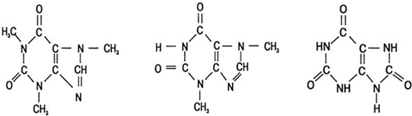 Рис. 1. Структурные формулы кофеина, теобромина и мочевой кислоты, свидетельствующие об их сходстве