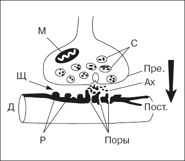 Рис. 2. Схема синапса: Пре. – пресинаптическая мембрана; Пост. – постсинаптическая мембрана; С – синаптические пузырьки; Щ – синаптическая щель; М – митохондрий; Ах – ацетилхолин; Р – рецепторы и поры (Поры) дендрита (Д) следующего нейрона; стрелка – одностороннее проведение возбуждения