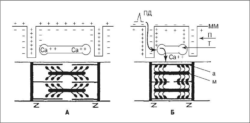 Рис. 10. Схема электромеханической связи в мышечном волокне. А – состояние покоя; Б – возбуждение и сокращение; ПД – потенциал действия; ММ – мембрана мышечного волокна; П – поперечные трубочки; Т – продольные трубочки и цистерны с ионами Са2+; а – тонкие нити актина, м – толстые нити миозина с утолщениями (головками) на концах. Зет-мембранами ограничены саркомеры миофибрилл. Толстые стрелки – распространение потенциала действия при возбуждении волокна и перемещение ионов Са2+ из цистерн и продольных трубочек в миофибриллы, где они содействуют образованию мостиков между нитями актина и миозина и скольжение этих нитей (сокращение волокна) за счет гребковых движений головок миозина