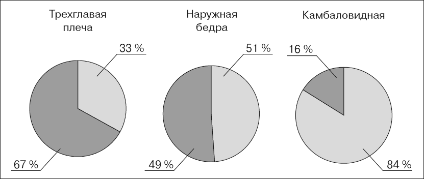 Рис. 14. Состав мышечных волокон в разных мышцах (медленные – светло-серым цветом; быстрые – темно-серым)