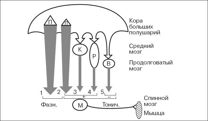 Рис. 15. Схема основных нисходящих путей регуляции двигательной деятельности: 1 – быстрая подсистема и 2 – медленная подсистема корково-спинномозгового пути (пирамидного тракта); 3 – корково-красноядерно-спинномозговой путь. Латеральная система – 1, 2, 3. Медиальная система – 4, 5. М – мотонейрон спинного мозга, получающий фазные (Фазн.) и тонические (Тонич.) возбуждающие (+) и тормозящие (-) влияния; П – пирамидная система; К – красная ядра; Р – ретикулярная система; В – вестибулярные ядра