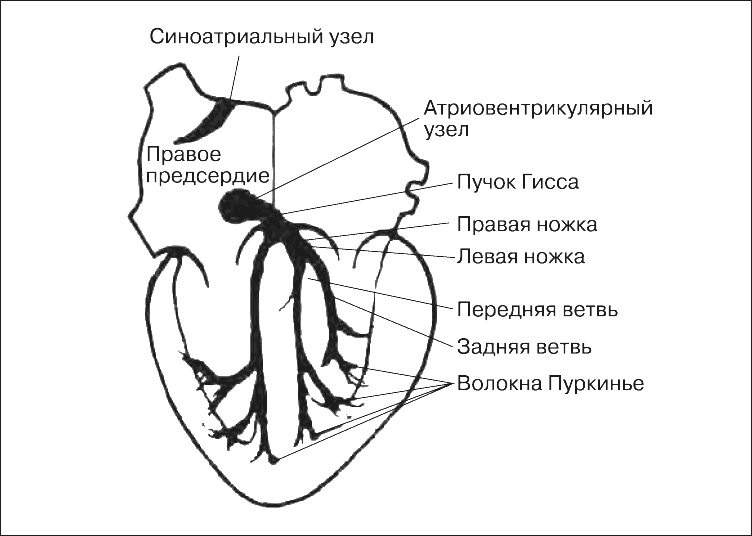 Рис. 18. Схема расположения водителя ритма (пейсмекера) и проводящей системы на фронтальном разрезе сердца