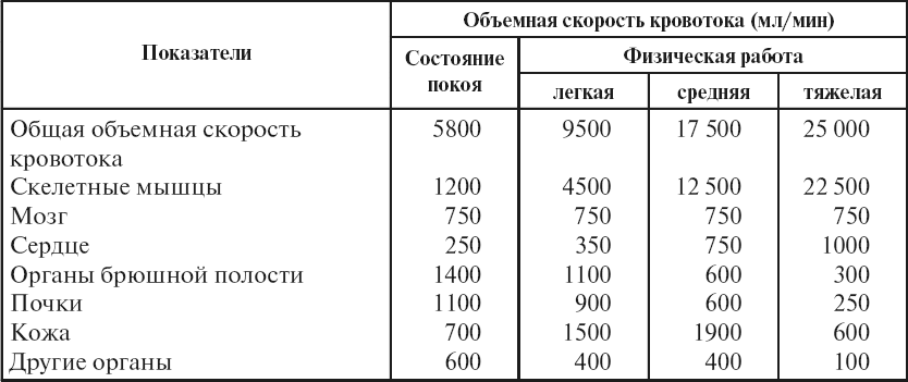 Объемной скоростью кровотока называют количество крови, которое протекает за 1 минуту через всю кровеносную систему. Эта величина соответствует МОК и измеряется в миллилитрах в 1 мин. Как общая, так и местная объемные скорости кровотока непостоянны и существенно меняются при физических нагрузках (табл. 3).