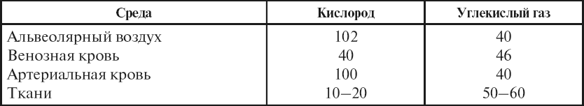 Переход О2из альвеолярного воздуха в кровь и СО2из крови в альвеолы происходит только путем диффузии. Никакого механизма активного транспорта газов здесь не существует. Движущей силой диффузии являются разности (градиенты) парциальных давлений (напряжений) О2и СО2по обе стороны альвеолярно-капиллярной мембраны или аэрогематического барьера. Напряжение газов в различных средах представлено в табл. 5.