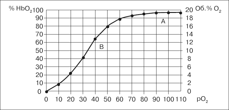 Рис. 21. Кривая диссонации оксигемоглобина в крови человека в покое: А – содержание HbO2, в артериальной крови, В – то же в венозной крови