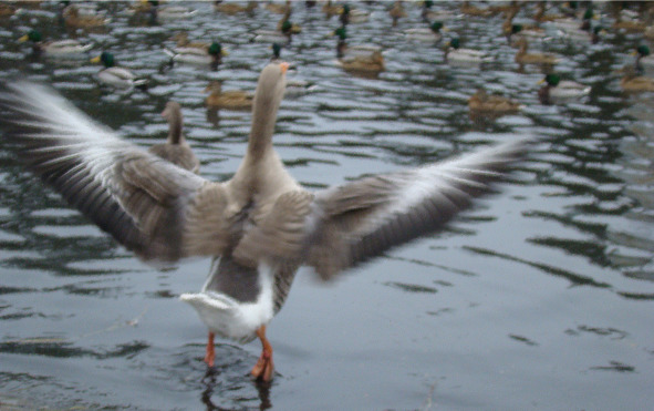 Гуси в демонстрационных полётах не участвуют. Они степенно расхаживают по берегу, задумчиво обзирают окрестности, беседуют друг с другом и вообще ведут себя гораздо спокойнее уток. По крайней мере, от нового человека не шарахаются, просто тихонько перемещаются на противоположный конец водоёма. Так, на всякий случай. Как ни всматривался, никаких отличительных признаков дикости у них не обнаружил. Одним словом, производят впечатление домашних.