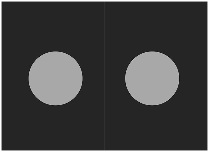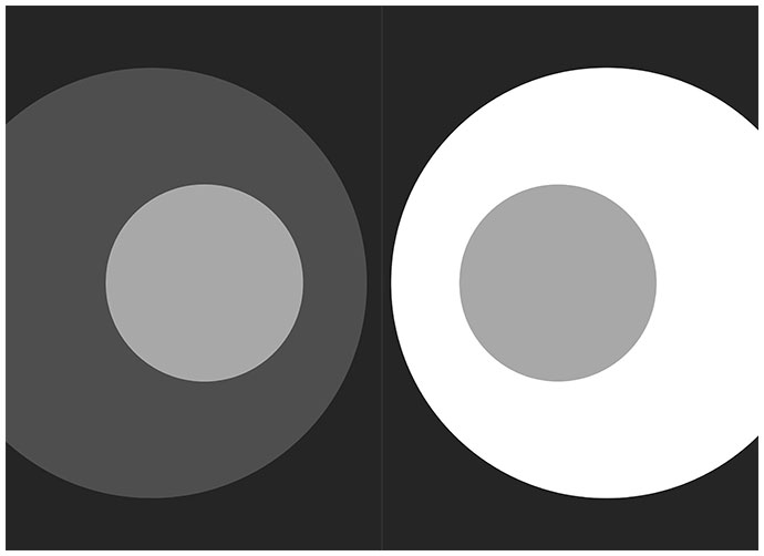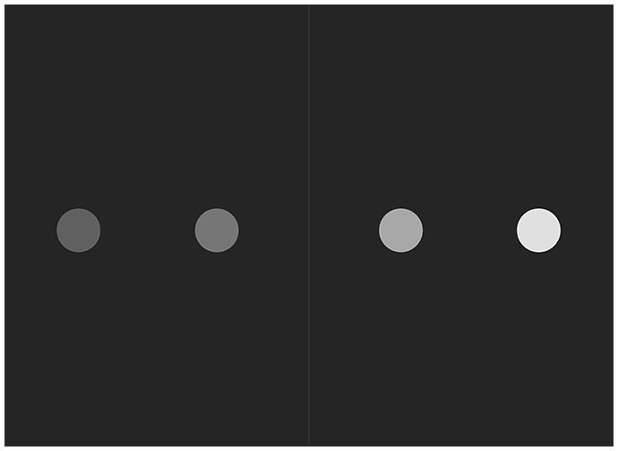 На первом из рисунков, которые вы найдете ниже, круги окрашены в разные оттенки серого. Легко заметить, что один темнее, а другой – светлее. Если предметы отличаются, они и выглядеть должны по-разному. Далее мы видим два кружка одинакового серого цвета.