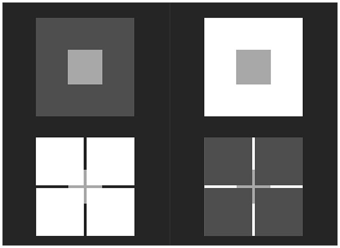 Это объективная реальность, которая коренным образом отличается от реальности нашего восприятия. И каждый, кто будет читать эту книгу, увидит эти три картинки так же, как увидели вы, – с теми же отклонениями от действительности, то есть от того, что показано на рисунках. При этом темный фон не единственная причина, почему мы видим изображение на нем бледнее, чем на светлом. Обратное тоже верно: светлый фон может сделать изображение на нем светлее, а темный – темнее. Это показано на четвертом рисунке, где центральные части, которые выглядят как круги, затемненные четырьмя прямоугольниками, кажутся разного цвета, как описано.