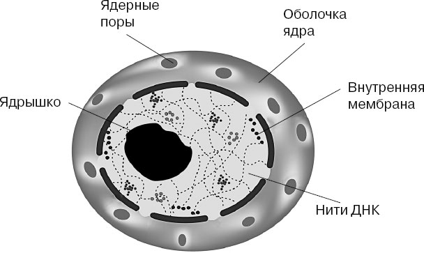 От цитоплазмы ядро отделяет ядерная оболочка, состоящая из двух разделенных промежутком мембран. В них, как и в клеточной мембране, есть поры, через которые происходит обмен веществами между ядром и цитоплазмой. Ядро имеет свою «цитоплазму», которая называется «нуклеоплазмой» или «кариоплазмой». В отличие от цитоплазмы, основу которой составляет вода, кариоплазма представляет собой коллоидный раствор белков и потому отличается высокими плотностью и вязкостью.