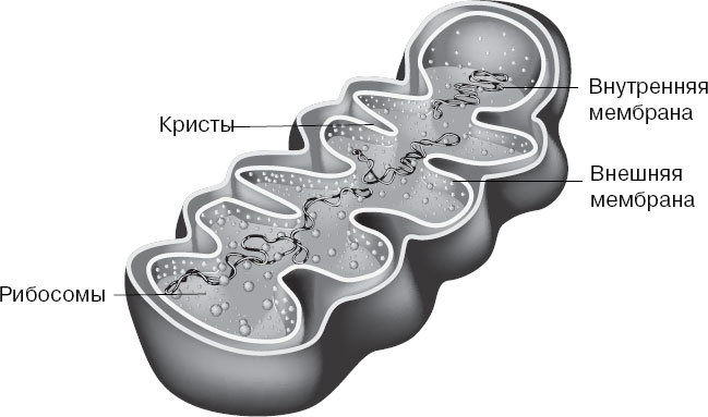 Митохондрии – это своеобразные энергетические станции клетки. Обычно в клетке содержится около 2-х тысяч митохондрий, общий объем которых составляет до четверти общего объема клетки. Митохондрии имеют сферическую или эллипсоидную форму. Мембран у митохондрии две – гладкая внешняя и складчатая внутренняя, которая образует множество поперечных перегородок, называемых «кристами».