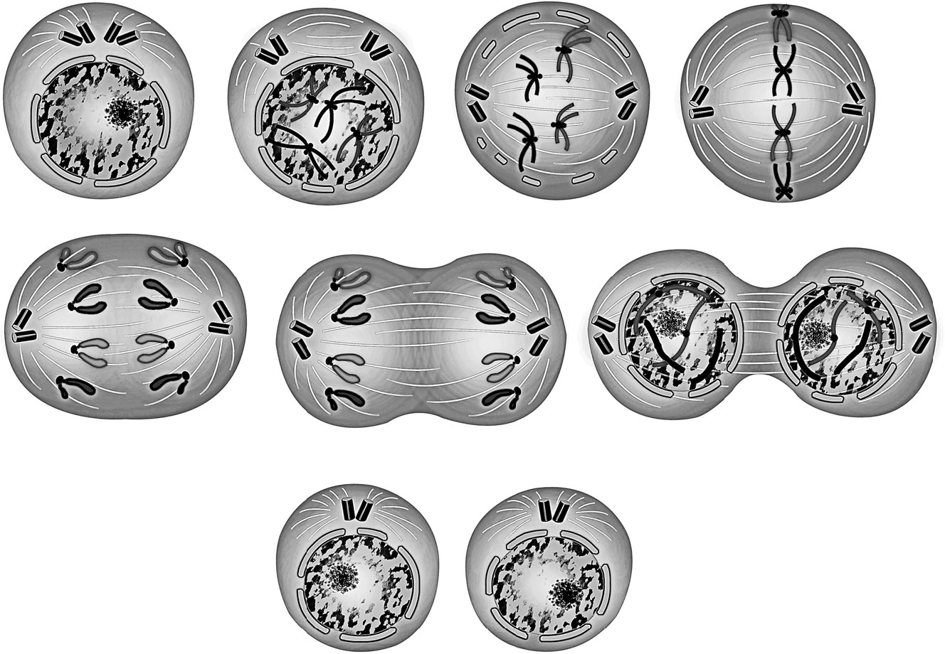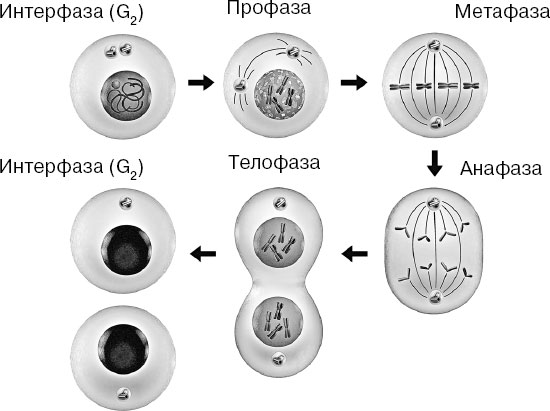 В заключительной, четвертой фазе, называемой «телофазой» – хромосомы раскручиваются в нити, вновь образуются ядра, микротрубочки веретена «собираются» в центриоли, делится цитоплазма, а в экваториальной зоне клетки образуется перетяжка, разделяющая две сестринские клетки.