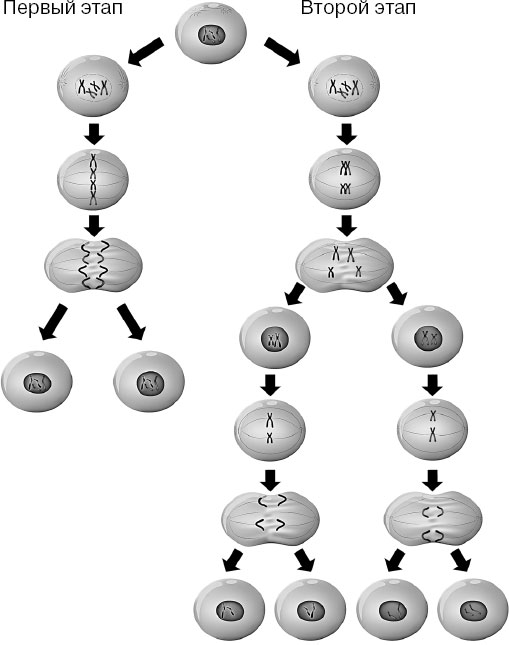 Процесс деления клеток, в результате которого не происходит удвоения числа хромосом в материнской клетке (т. е. дочерние клетки получают по половинному набору хромосом), называют «мейозом». Мейоз проходит в два этапа. Первое деление клеток происходит с удвоением числа хромосом, но при делении хромосомные пары не разделяются надвое, дочерние клетки получают от материнской парные хромосомы, скрепленные центромерами.