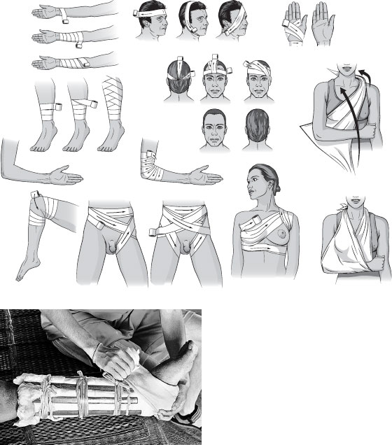 – можно использовать бинт или прочные широкие ленты, но не следует крепить шину веревками, так как узкая веревка может глубоко впиться в ткани и вызвать нарушение кровообращения.