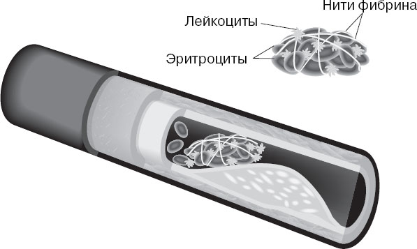 Одним из важнейших компонентов плазмы является белок фибриноген, который при свертывании крови образует нерастворимые нити фибрина, в сплетении которых застревают клетки крови. Получается тромб – «пробка», закупоривающая просвет поврежденного сосуда.