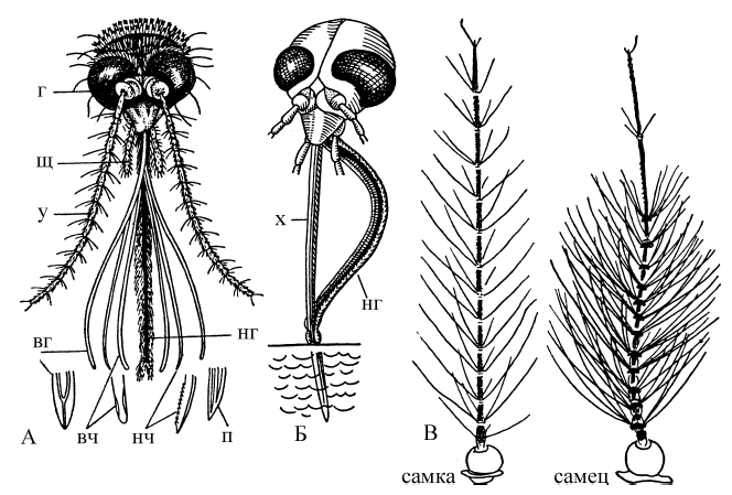 А – голова с расщеплённым хоботком, Б – хоботок в момент начала кровососания, В – усики; вг – верхняя губа, вч – верхняя челюсть, г – голова, нг – нижняя губа, нч – нижняя челюсть, п – подглоточник, у – усик, х – комплекс колющих частей хоботка, щ – щупик.