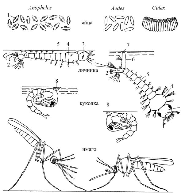 Личинки комаров, в отличие от взрослых форм, ведут водный образ жизни. Тело личинки состоит из склеротизированной головы, груди и брюшка, на конце которого имеются орган движения – плавник, а также жабры и стигмальные пластинки, служащие для дыхания атмосферным воздухом. В своем развитии личинка проходит четыре стадии; в конце последней её размеры могут колебаться от 0,5–0,7 см у мелких видов и до 1,5 см у более крупных. Особого внимания заслуживает тема питания личинок: они могут быть фильтраторами (питаются взвешенными в воде микроорганизмами и частицами органического вещества или собирают их с поверхности воды), “соскрёбывателями” (соскабливают налёт с растений и находящихся в воде предметов) и реже хищниками; у некоторых видов комаров совмещаются два первых типа питания.